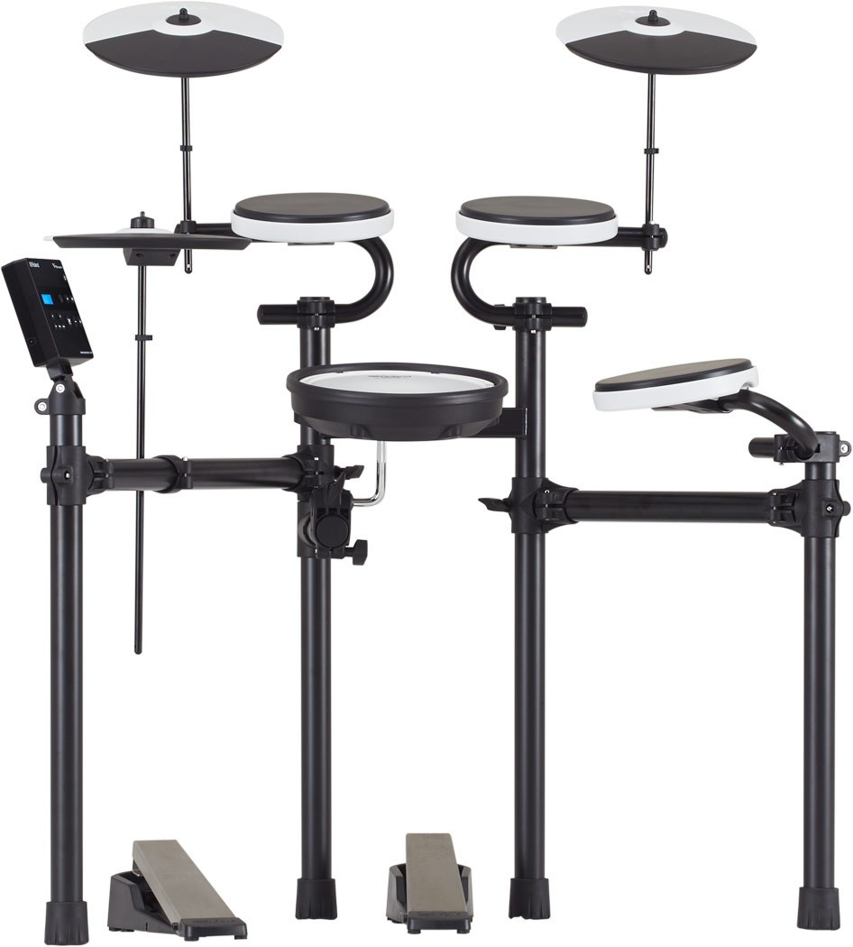 The Roland TD-02KV Digital Drum Kit is the perfect way to get started on your drumming journey. With its compact size and affordable price, it's perfect for drummers of all ages and skill levels. The TD-02KV features a mesh-head snare pad with natural acoustic stick feel, a rugged four-post stand with a wide acoustic-style playing layout, and three tom pads, a quiet beaterless kick pedal, and three cymbal pads (hi-hat, crash, and ride).